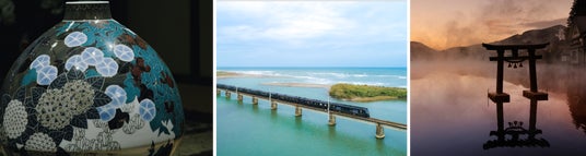 左:有田焼(佐賀県有田町) 中:小丸川橋梁(宮崎県高鍋町) 右:金鱗湖(大分県由布市)