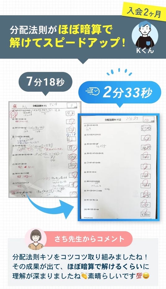 - "わたしを見てわたしだけの注意をしてくれる"という点が集団塾と違い娘は嬉しかったようです。毎日計算してただ丸つけをするだけではなく、弱点をプリントで補強できたこと、どんなときもコメントをいただけて励まされました。