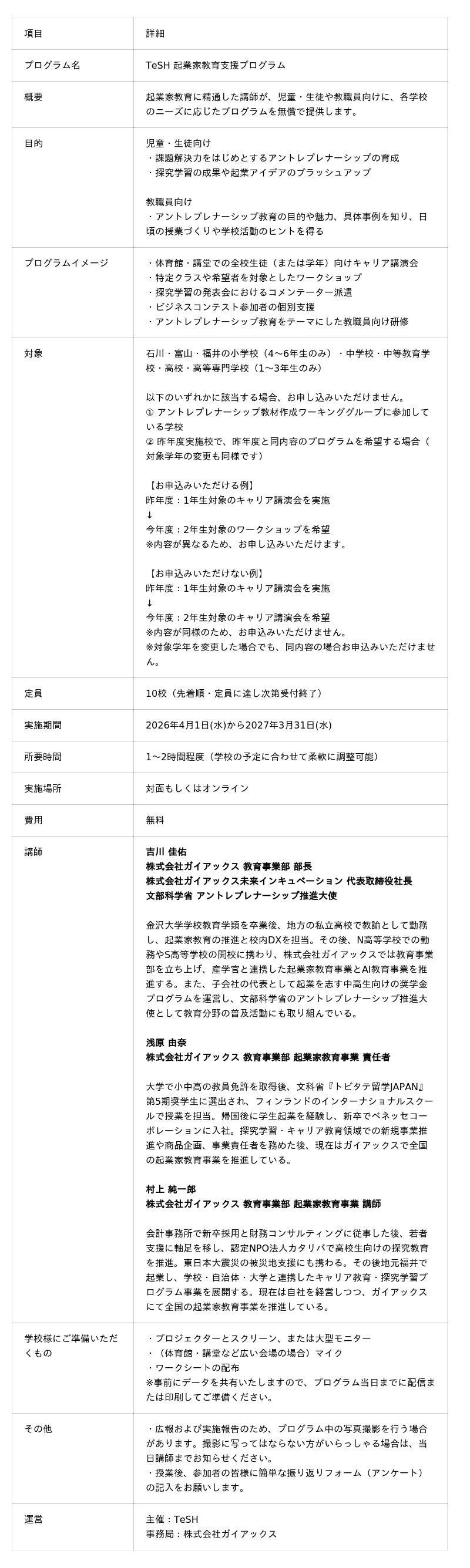 本プログラムは、北陸地域におけるアントレプレナーシップ教育の認知拡大と学校現場での実践支援を目的としており、2026年4月から2027年3月まで実施いたします。プログラムは授業内外で活用しやすいよう、児童・生徒向けの講演会やワークショップ、探究学習の発表会でのコメンテーター派遣、ビジネスコンテストに向けた個別支援、そして教職員向けの研修など、学校のニーズに合わせた形で提供します。