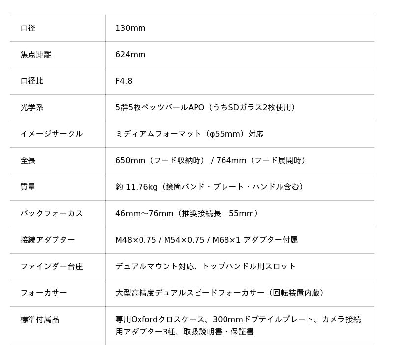 - ペッツバール構造により、鏡筒単体でフラットな像面を得ることができます。すべてのレンズが適切な位置に固定されていることで、面倒なバックフォーカス計算を気にすることなく、46mm~76mm(推奨55mm)の範囲でピントを合わせられます。