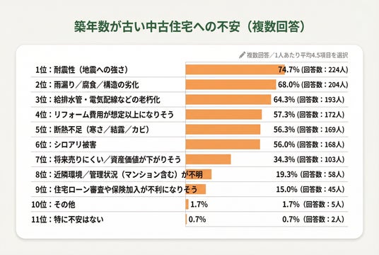 【結果5】築年数が古い中古住宅への不安:耐震性74.7%(224人)が最多。1人あたり平均4.5項目を選択