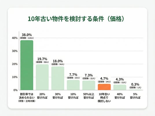 一方で、20%安ければと30%安ければが合計で約4割を占める点も重要です。明確な割引率の基準を持っている層も一定数おり、10年の築年数差に対して2~3割の価格調整が妥当と考えられている実態がうかがえます。