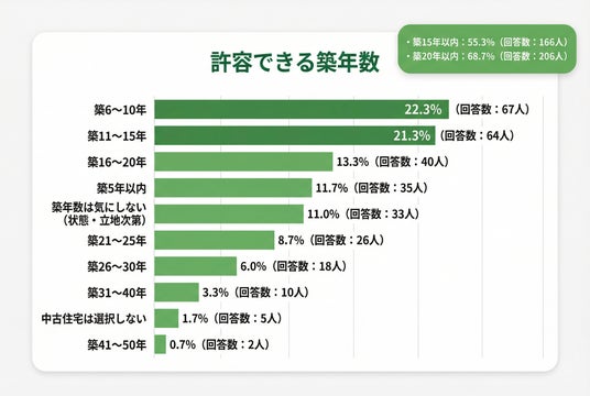 ※築15年以内まで許容する人は55.3%(166人)、築20年以内まで広げると68.7%(206人)