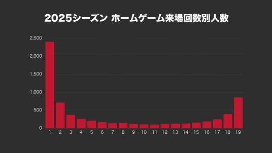 2025シーズンのホームゲーム来場者を来場回数別にみると、1回のみの方が2,396人と最多ですが、次いで多いのが全19試合を訪れる熱狂的なサポーター(854人)となっています。