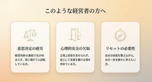 定期的なオンラインセッションを通じて、経営判断の土台となる心の安定や、自分らしい意思決定を支える場を提供します。