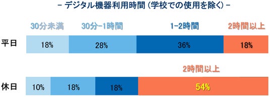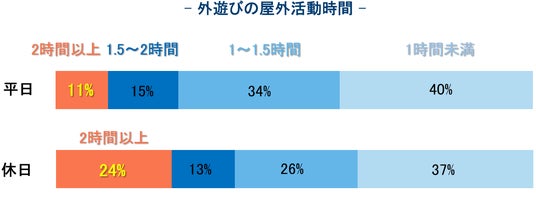 平日における家庭でのスマートフォンやタブレットなどのデジタル機器の利用時間は、多くの家庭では2時間以内が大半だったのに対し、休日ではデジタル機器を「2時間以上」使用している家庭は約半数にのぼりました。一方、近視抑制に有効とされる「2時間以上の屋外活動」を実施している家庭は2割程度でした。