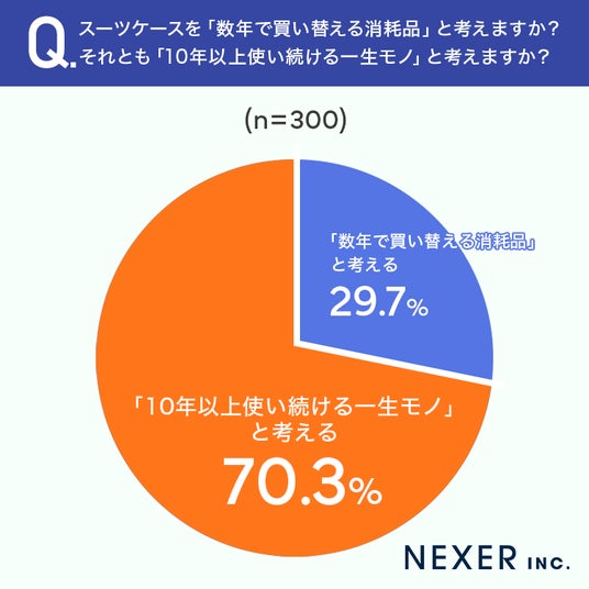 続いて、スーツケースを「消耗品」と考えるか、「長く使い続ける一生モノ」と考えるかについて聞いてみました。