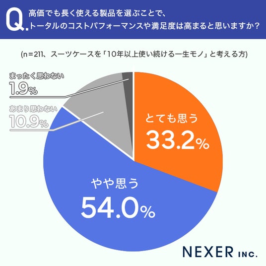 続いて、スーツケースを「10年以上使い続ける一生モノ」と考える方に、高価でも長く使える製品を選ぶことで、結果的にコストパフォーマンスや満足度が高まると思うかを聞いてみました。