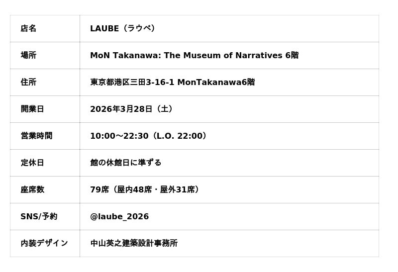 2026年3月28日(土)、株式会社WAT(本社:東京都目黒区、代表取締役:石渡康嗣)は、高輪ゲートウェイエリアに新たに誕生する文化施設「MoN Takanawa: The Museum of Narratives」の最上階6階に、ルーフトップダイニング「LAUBE(ラウベ)」をオープンいたします。