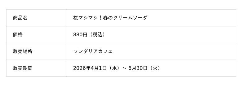 ワンダリアカフェには、ワンダリア横浜のオープンを彩る、期間限定メニュー「桜マシマシ!春のクリームソーダ」が2026年4月1日から登場します。「神奈川・横浜デスティネーションキャンペーン プレキャンペーン」の開催にあわせて、ワンダリアカフェのノーマルメニューである「春の桜クリームソーダ」のエディブルフラワーを贅沢に増量した特別仕様で提供します。