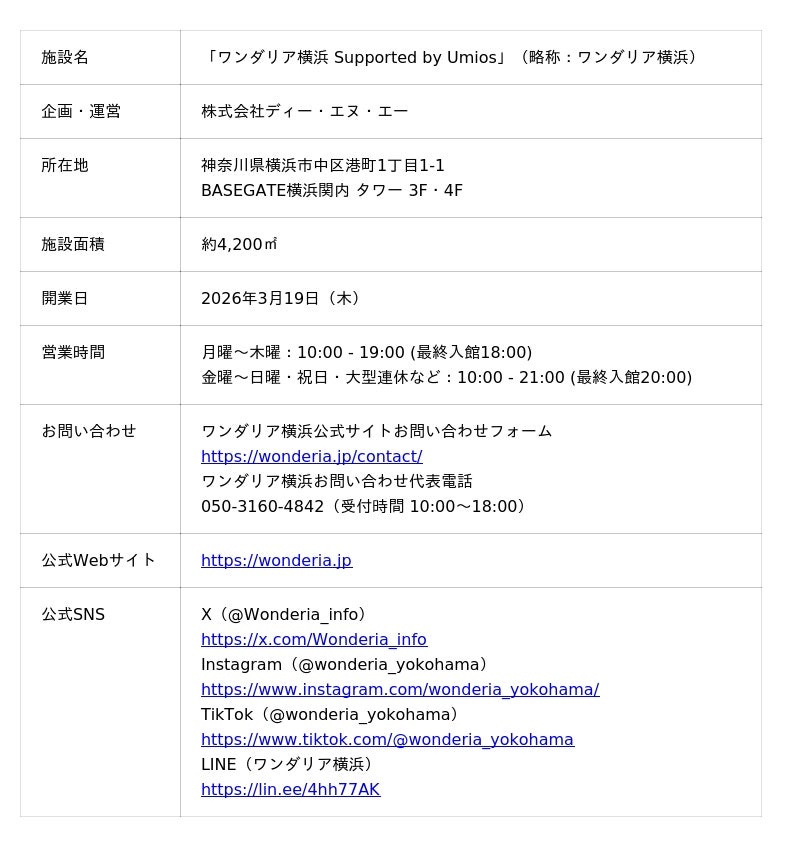 株式会社ディー・エヌ・エー(本社:東京都渋谷区、代表取締役社長兼CEO:岡村信悟、以下 DeNA)は、没入型体験施設「ワンダリア横浜 Supported by Umios」(以下、ワンダリア横浜)を2026年3月19日(木)に開業しました。「いつもの風景が驚きに変わる感動体験」を提供することを目指しているワンダリア横浜は、開業を記念し、公式ブランドムービーを公開するとともに、「ワンダリアアプリ」のシームレスな体験の詳細情報および地域連携施策についてお知らせします。
