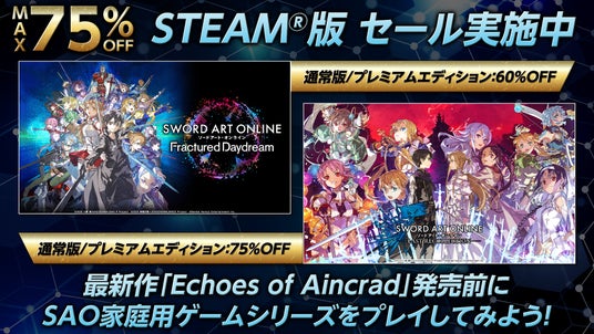 最大75%OFFでお得に購入できる!STEAM(R)版 『ソードアート・オンライン フラクチュアード デイドリーム』&『ソードアート・オンライン ラスト リコレクション」』セール実施中!