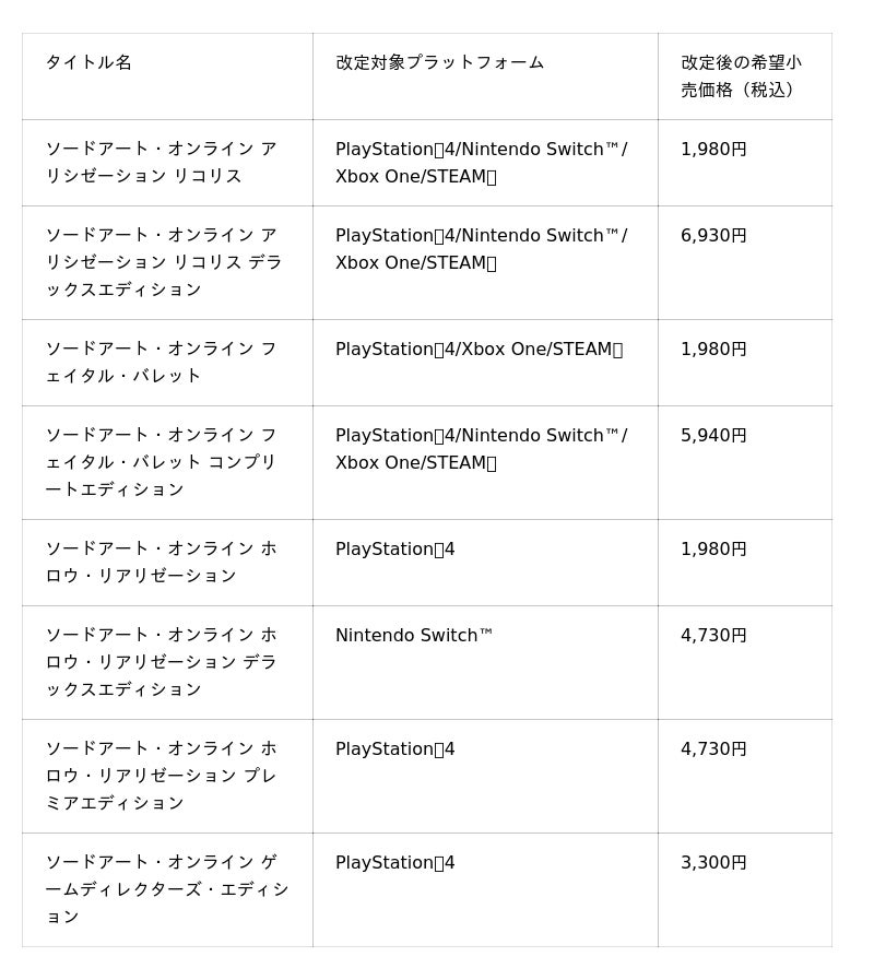 『ソードアート・オンライン アリシゼーション リコリス』以前のSAO家庭用ゲームシリーズがさらにお得に!ダウンロード版 希望小売価格改定のお知らせ