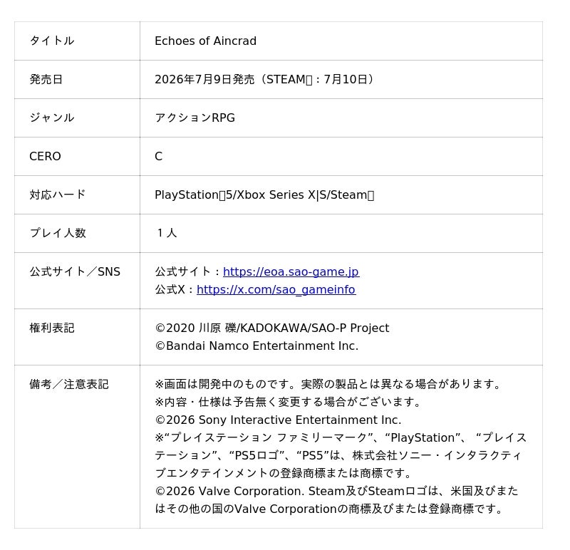 ◇『Echoes of Aincrad』公式サイト: https://eoa.sao-game.jp/