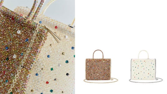 マルチカラーのビーズがランダムに装飾されたどこか遊び心のあるデザインの「GEMME(ジェンメ)」。こちらも間口にジッパーを付けたチェーンショルダーバッグタイプで登場。ユニークなカラーのシャンパンマルチと透明感が魅力のオーロラトラスパレンテの2色展開。