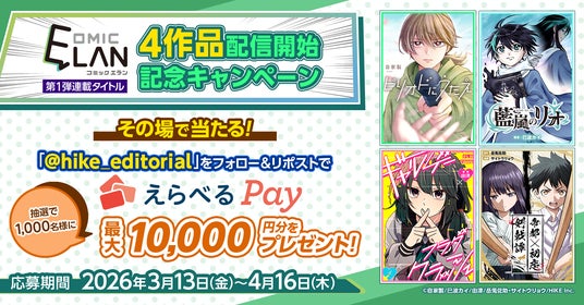 「COMIC ELAN」(コミックエラン)4作品の配信開始を記念し、4月16日(金)まで、抽選で1,000名様に「えらべるPay」最大10,000円分をプレゼントするキャンペーンを実施中です。応募条件はHIKE編集部公式Xアカウントをフォローし、該当する投稿をリポスト。当選はその場で分かります。この機会にぜひご応募ください!