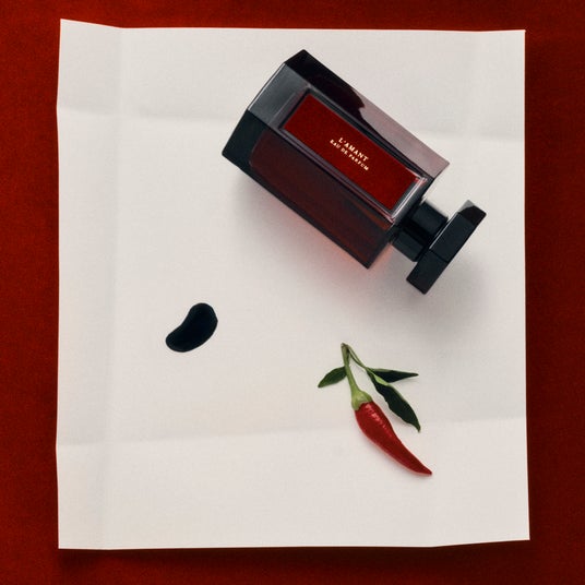 炎が記す物語最初に立ち上るのは、灼けつくような赤い色をしたピメントリーフのシャープな辛み。それは一瞬にし て燃え上がる恋の火花のよう。ミネラリーなレザーアコードはインクのような深みで肌に欲望の刻印を残す。そしてこの2つの香りをつなぐパチョリは、告白と秘密の間に横たわる隙間を暗闇が白い光を浸食するように一つにしていく。やがて影の中からシプリオール、サンダルウッド、ヴェチバーが姿を現し、親密さを込めてそっと肌を包み込む。その香りの抱擁は、禁忌めいた余韻を静かに引き延ばし、心をとらえて離さないのです。