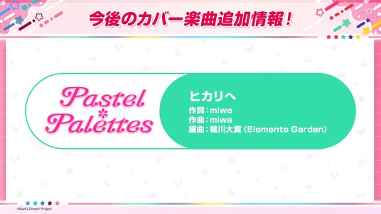 Pastel*Palettesの歌うカバー楽曲『ヒカリへ』の、ゲーム内への追加が決定いたしました。詳細は続報をお待ちください。