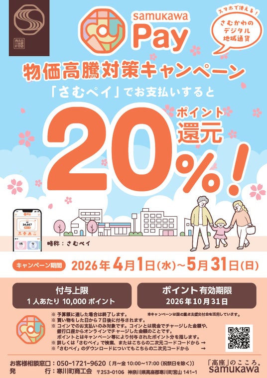 物価が高騰している中、生活されている方々への支援及び商業者の方々の支援のために、物価高騰対策といたしまして、20%ポイント還元キャンペーンを開催します。