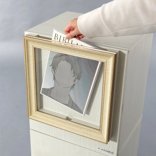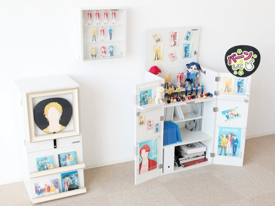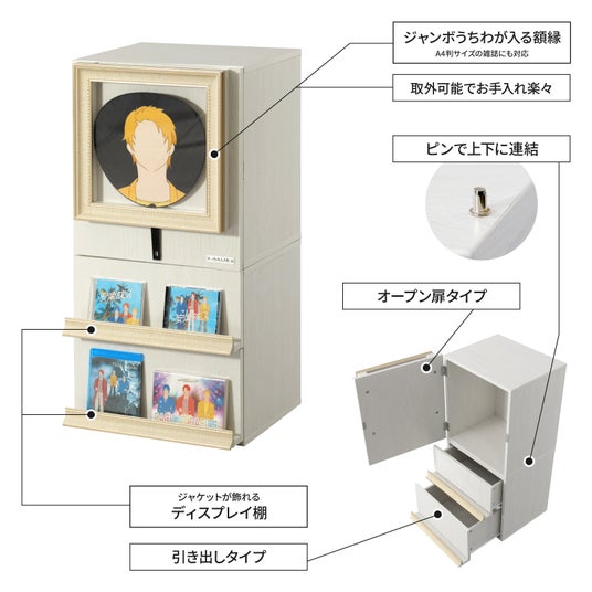 推しのすばらしいビジュを堪能できる専用額を扉に搭載した、カラーボックスタイプの推し棚です。保管方法に困りがちなジャンボうちわ・雑誌・CD/DVD類を、大量に&スッキリ収納できます。狭い居室にも省スペースに設置可能で、「オタク部屋」の"推し祭壇"としてディスプレイ性も抜群。いつでも推しの"顔が良い"を最大に堪能できます。