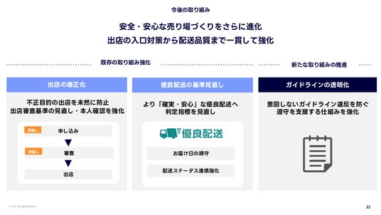出店審査基準の見直しや本人確認の強化により、不正目的の出店を未然に防止します。また、「優良配送」の適正化を目指し、「優良配送」の判定基準の見直しを予定しています。さらに、ガイドライン違反内容に関する情報提供を充実させ、遵守を支援する仕組みを強化することで、ストアが安心して運営できる環境づくりを進めていきます。