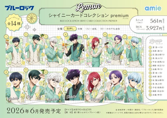 フィギュア&ホビー通販大手の「あみあみ」を運営する大網株式会社(本社・東京都文京区)は、自社が展開するグッズブランド「amie(アミィ)」から、TVアニメ『ブルーロック』の「レモン」がテーマの描きおろし商品として、「トレーディング箔押し缶バッジ」「シャイニーカードコレクション premium」「ぴくりあプレート hologram」「ステラフォトsparkle」「Sparkle*チェーンアクリル」「アクリルスタンド」を発売いたします。