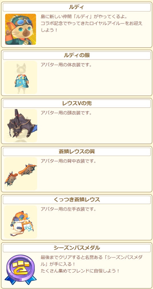 イベントに参加してコラボ記念でやってきたロイヤルアイルー「ルディ」を島にお迎えしたり、アバター用の装備「ルディの服」などの豪華な報酬を獲得しよう!