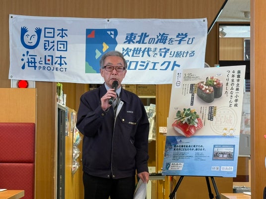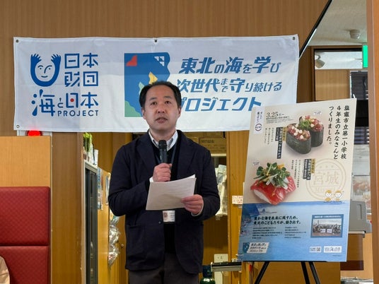 塩竈市の理由としては、古くから有数の水産都市として発展してきた街であり、こどもたちが海の現状を学び未来を考える場としてふさわしいと考えたためです。今回は塩竈市立第一小学校の4年生に参加してもらい、7月には地元の水産現場を見学する校外学習や、専門家を招いたミーティングを行いました。夏休み明けには小学生に考えてもらったおすしのアイデアを発表してもらいました。スシローのメニューとして実現したことは、本プロジェクトの大きな成果の一つだと感じております。東北の海の恵みについて考える一つのきっかけになれば嬉しいです。」