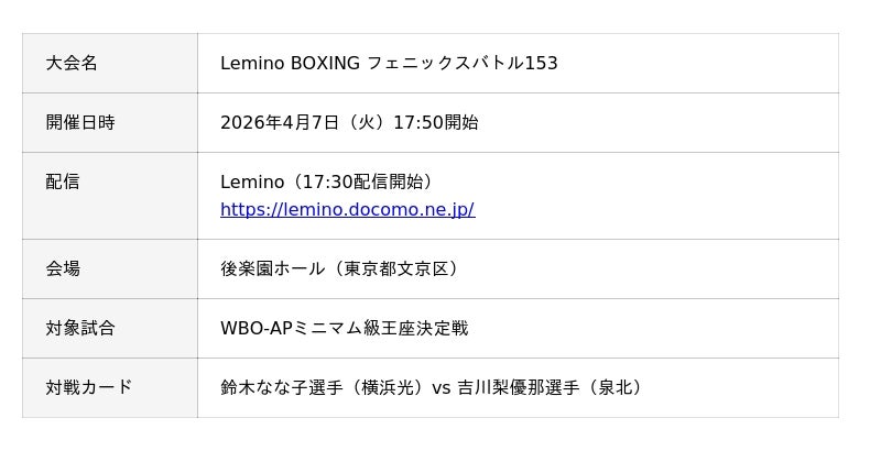鈴木なな子選手は、同大会において吉川梨優那選手と対戦予定です。会場は後楽園ホール、対戦試合はWBO-APミニマム級王座決定戦として実施され、Leminoでの生配信も予定されています。
