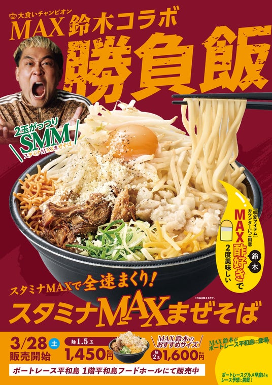 京急ロイヤルフーズ株式会社(所在地:東京都大田区、取締役社長:小島賢二)は、大食いチャンピオンとして人気を誇るMAX鈴木氏とのコラボレーションメニュー「スタミナMAXまぜそば(通称:SMM)」を、2026年3月28日(土)よりボートレース平和島内「平和島フードホール」にて期間限定で販売いたします。
