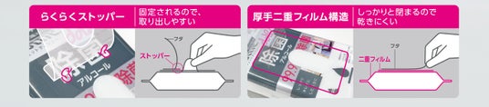 ・乾きにくい厚手二重フィルム構造フタの部分のフィルムが密着せず隙間ができるとシートが乾きやすくなるため、二重構造のフィルムを採用することで、しっかりと閉まり乾きにくい