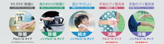 除菌アルコールタイプ/除菌ノンアルコールタイプ/純水ノンアルコールタイプ<新発売>/消毒アルコールタイプ<リニューアル>/消毒ノンアルコールタイプ<リニューアル>