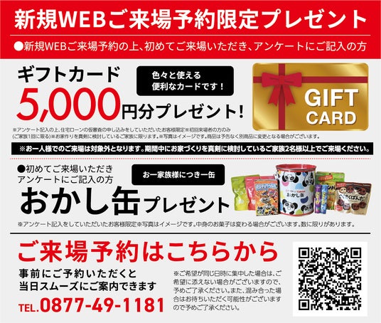 WEBからの事前予約の上、初めてご来場いただいた方を対象にギフトカード5,000円分プレゼント