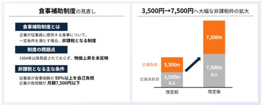 こうした個人の購買力が限界を迎える中で、注目されるのが企業の役割です。2026年4月の税制改正では、食事補助の非課税限度額が42年ぶりに月額3,500円から7,500円へと大幅に拡充されます。