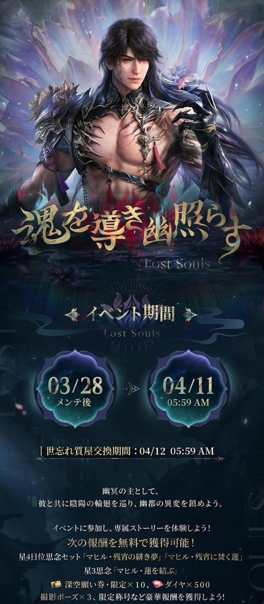 INFOLD PTE. LTD.は、全世界ユーザー数が8000万人を突破した恋愛シミュレーションゲーム『恋と深空』において、3月28日(土)11時より日位星4セット思念を無料で獲得できるイベント「魂を導き幽照らす」を開催することをお知らせいたします。限定願う「万鬼、跡絶ゆ」ではマヒルの新日位星5セット思念が登場します。