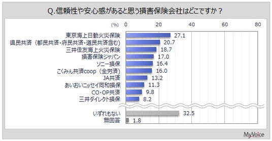 信頼性や安心感があると思う損害保険会社は(複数回答)、「東京海上日動火災保険」が27.1%、「県民共済」が20.7%、「三井住友海上火災保険」が18.7%です。