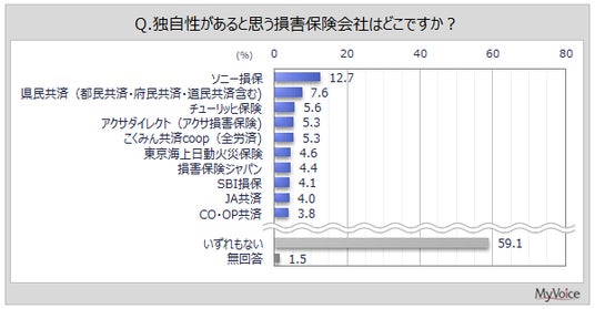 独自性があると思う損害保険会社は(複数回答)、「ソニー損保」が12.7%、「県民共済」が7.6%、「チューリッヒ保険」が5.6%です。