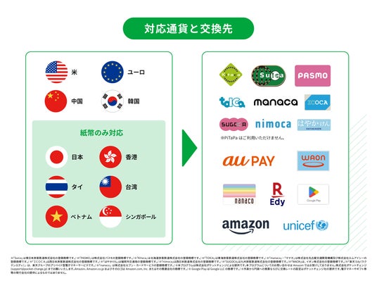 Pocket Changeとは、外国硬貨・紙幣を電子マネーやギフトコードに交換できるサービスです。端末のタッチ操作のみで、事前登録なしに、Suica等の交通系ICカードや楽天Edy、Amazonギフトカードなど、多彩なサービスにその場で交換できます。