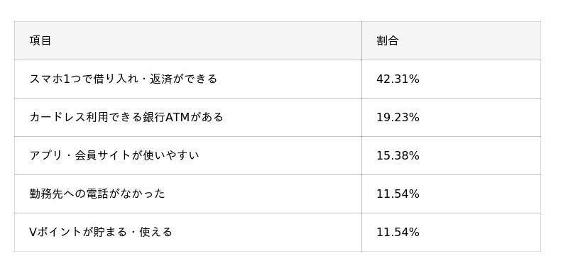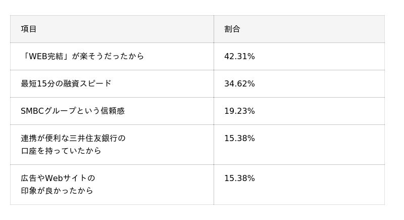 - 選んだ決め手として「WEB完結が楽そう(約42%)」が最多。実際に利用した際も「スマホ1つで借り入れ・返済ができる」点が最も好評で、場所を選ばない便利さが高く評価されている。