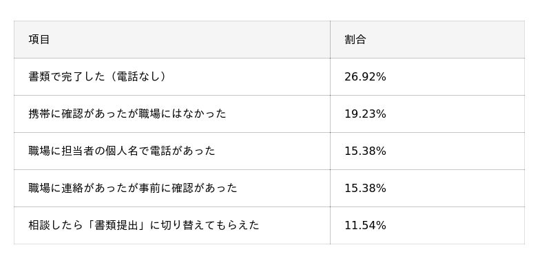 - 心理的ハードルとなる「職場への電話連絡」についても、約27%が「書類で完了(電話なし)」と回答。「携帯に確認があったが職場にはなかった」(19.23%)という声も多く、「原則として職場への電話連絡なし」という特徴が実際の審査でも反映されているとわかった。