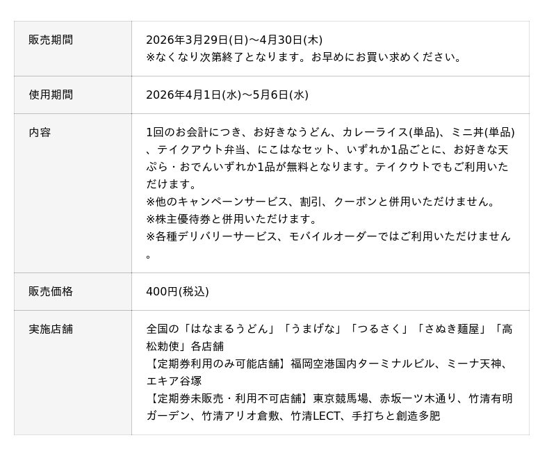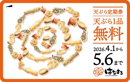 讃岐うどんチェーン「はなまるうどん」を展開する株式会社はなまる(本社:香川県高松市、代表取締役社長:前田良博)は、2026年3月29日(日)より全国の「はなまるうどん」「うまげな」「つるさく」「さぬき麺屋」「高松勅使」各店舗(※一部店舗除く)で、『天ぷらおでん定期券』を販売いたします。