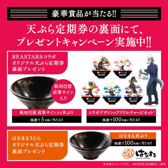 現在実施中の第1弾コラボでも大きな反響を呼んでいる通り、原作者の板垣巴留先生は学生時代に「はなまるうどん」で3年間アルバイトをされていたというご縁があります。第2弾となる今回は、本コラボ限定の描き下ろしビジュアル(レゴシ)/描き起こしイラストがデザインされた限定定期券が登場します。数量限定発売のため、なくなり次第販売終了いたします。