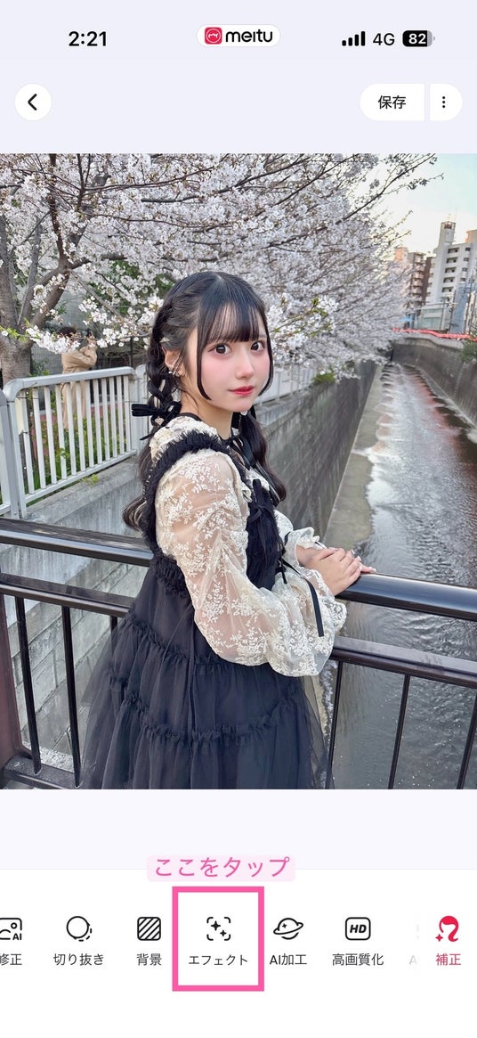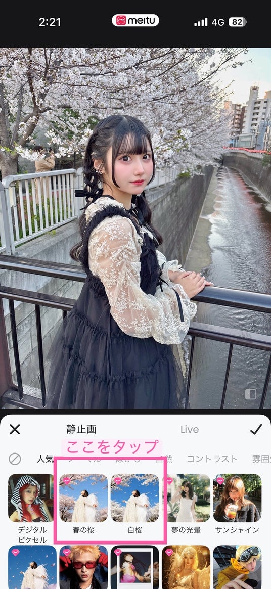 ■ 機能紹介:最適な密度で描写する「春の桜」「春の桜」エフェクトは、画像内の桜の枝や木を自動で認識し、不足している花びらを自然な形で補完する機能です。5分咲きや散り始めの状態であっても、ワンタップで画面いっぱいに広がる満開の景色を生成します。