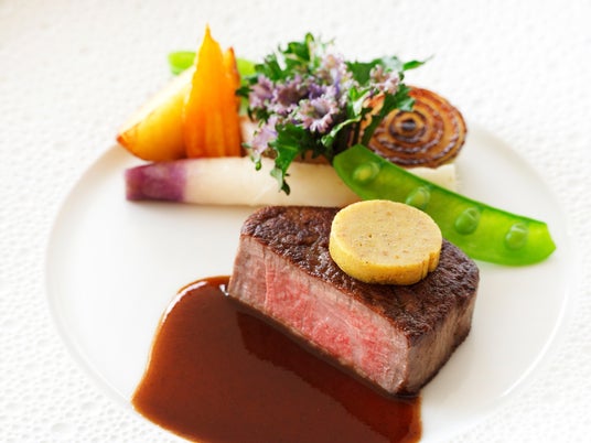 相模湾や伊豆山、また富士山麓から採れる半径50キロ圏内の旬の食材を使用した、総料理長 北野智一渾身のディナーコース「熱海キュイジーヌ」。4月・5月にご提供するコースでは、地元の旬野菜の素材の旨味を凝縮したアミューズに始まり、春の風景を閉じ込めたような色鮮やかな冷菜、桜エビやシイタケが織りなす香り高い温菜をご用意しております。メインは、赤身の旨味が際立ちコク深い静岡のブランド牛「愛鷹牛」のフィレのポワレや、きめ細やかで柔らかな肉質と上品な旨味が特徴の仔ウサギを用いた繊細な味わいの一皿など、多彩な4種類からお選びいただけます。相模湾を望む開放的なダイニングで、一皿一皿に舌鼓を打ちながら、笑顔が響き合うディナータイムをお過ごしください。