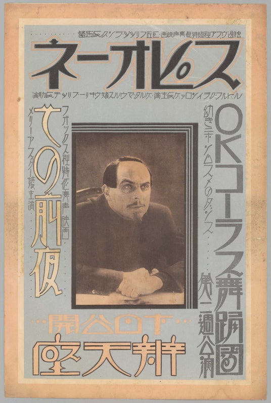 (辨天座 ポスター)フリッツ・ラング監督の『スピオーネ』とヘンリー・レアマン監督の『その前夜』が辨天座で上映された際のポスター。ダンスの興行もおこなわれていたことがわかる。