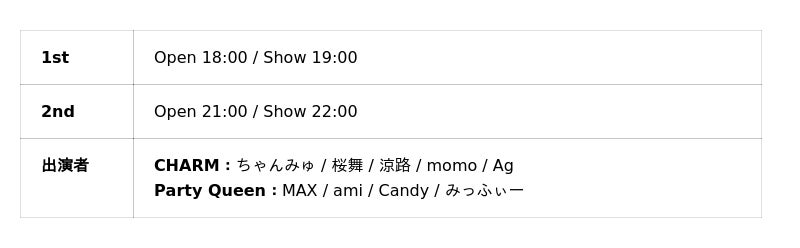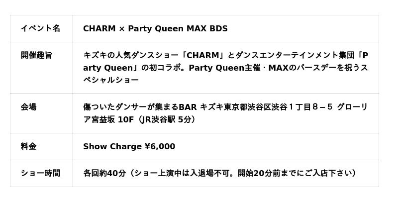 東京・渋谷にある「傷ついたダンサーが集まるBAR キズキ」」(運営:株式会社グレイド/代表:澤田佳宏)では、2026年3月28日(土)と29日(日)の2日間、ダンスショーイベント「CHARM × Party Queen MAX BDS」を開催。