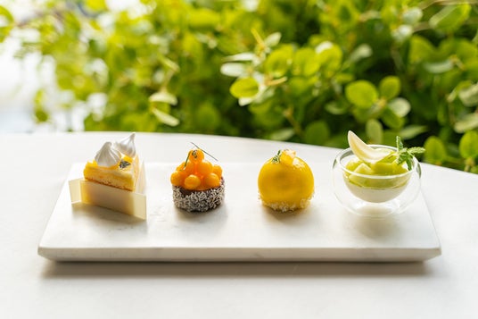 今回は、新緑が美しい グラングリーン大阪 の景色とともに、季節の色彩とみずみずしさを食で味わえるBOXをご用意しました。メロンや完熟マンゴーと旬を迎えるフルーツを楽しめるスイーツと、日向夏や新玉ねぎ、そら豆など、初夏にしか味わえない食材を贅沢に使用したセイボリー。