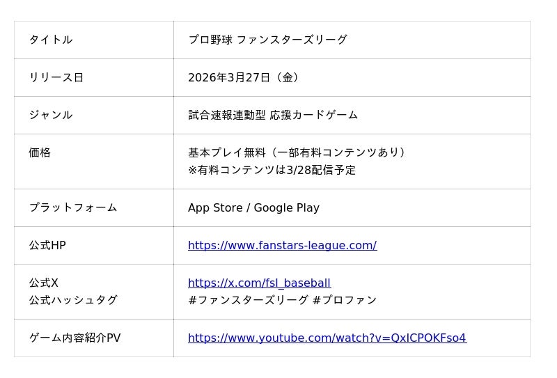 株式会社バンダイ カード事業部(本社:東京都台東区)は、App Store/Google Play向けスマートフォンアプリとなる試合速報連動型応援カードゲーム『プロ野球 ファンスターズリーグ』を、3月27日(金)に配信開始したことをお知らせいたします。なお、本アプリと連動するトレーディングカード「ブースターパック パ・リーグ 2026 Vol.1」ならびに「ブースターパック セ・リーグ 2026 Vol.1」は、明日3月28日(土)に全国の販売店にて販売開始となります。