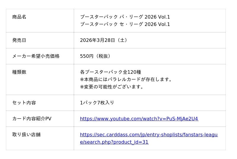 『プロ野球』×『アプリ』×『カード』の最強打線が生み出す“試合速報連動型応援カードゲーム”ファンスターズリーグの第1弾ブースターパックが2026年3月28日(土)に全国の販売店にて発売となります。