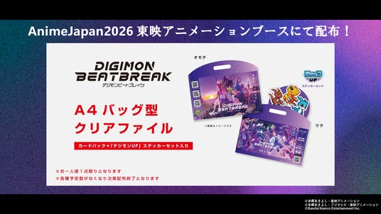 2026年3月28日(土)、29日(日)に開催の「AnimeJapan2026」東映アニメーションブースにて、TVアニメ「DIGIMON BEATBREAK」の出展が決定!ブースでは【タクティクス編】のキャラクターパネル展示や、ゲッコーモンのグリーティングを実施いたします。さらに、メインビジュアルを使用した「A4バッグ型クリアファイル」の配布も決定!中には新作アプリゲーム「デジモンUP」のドットイラストを使用したオリジナルステッカーセットも封入!数量限定となりますのでお見逃しなく。
